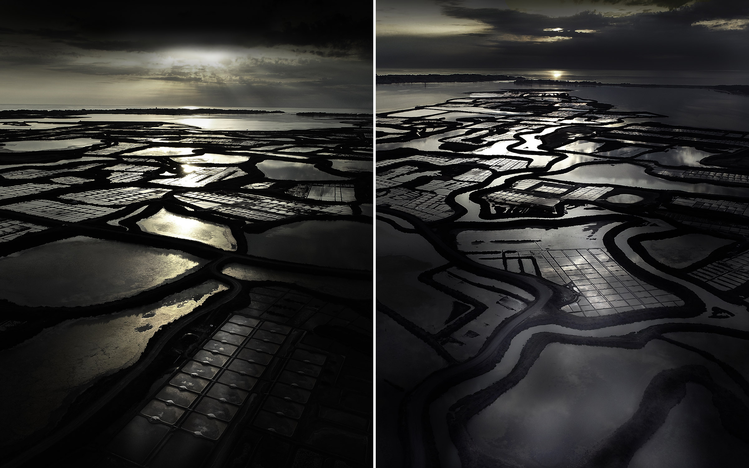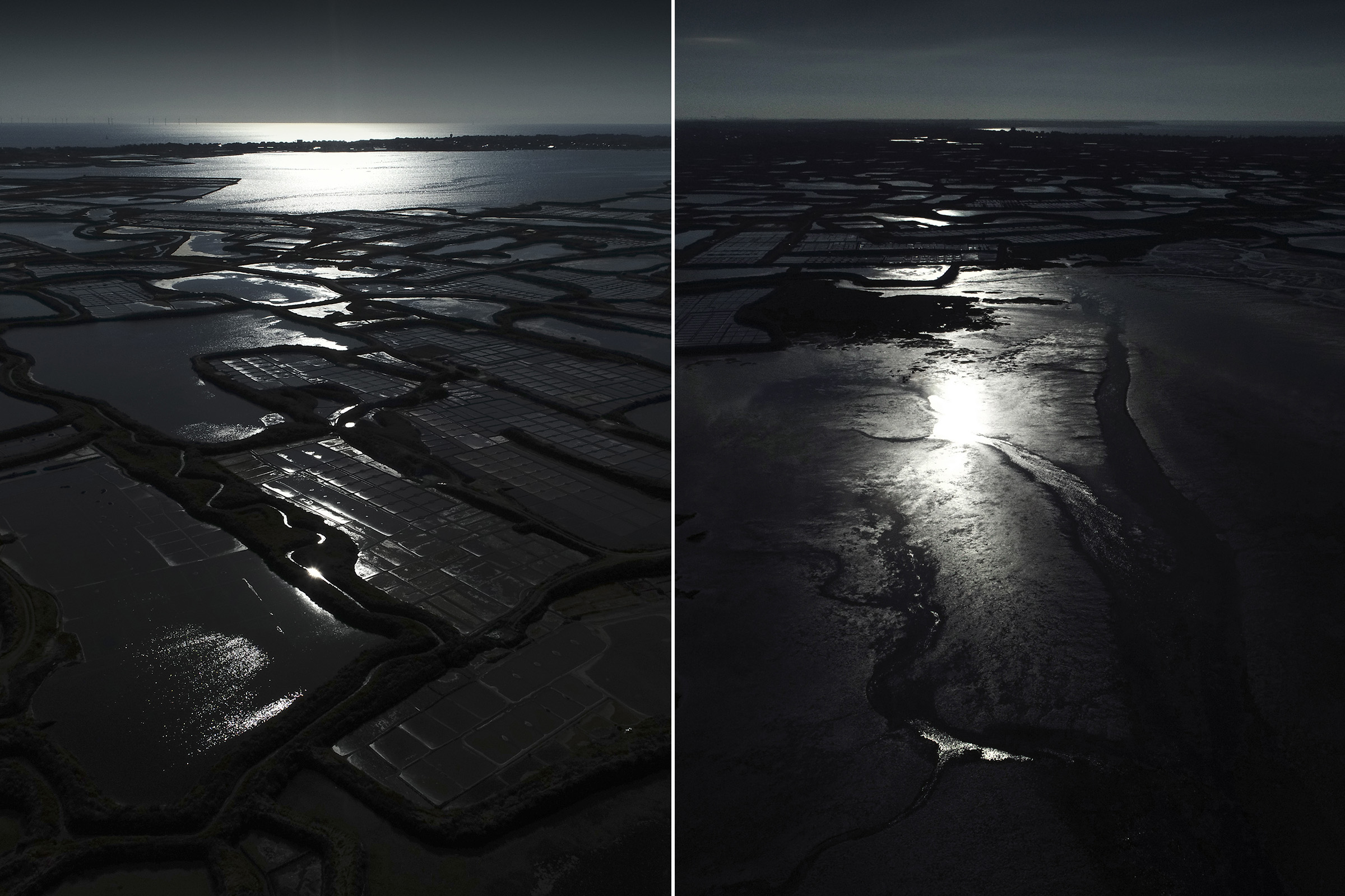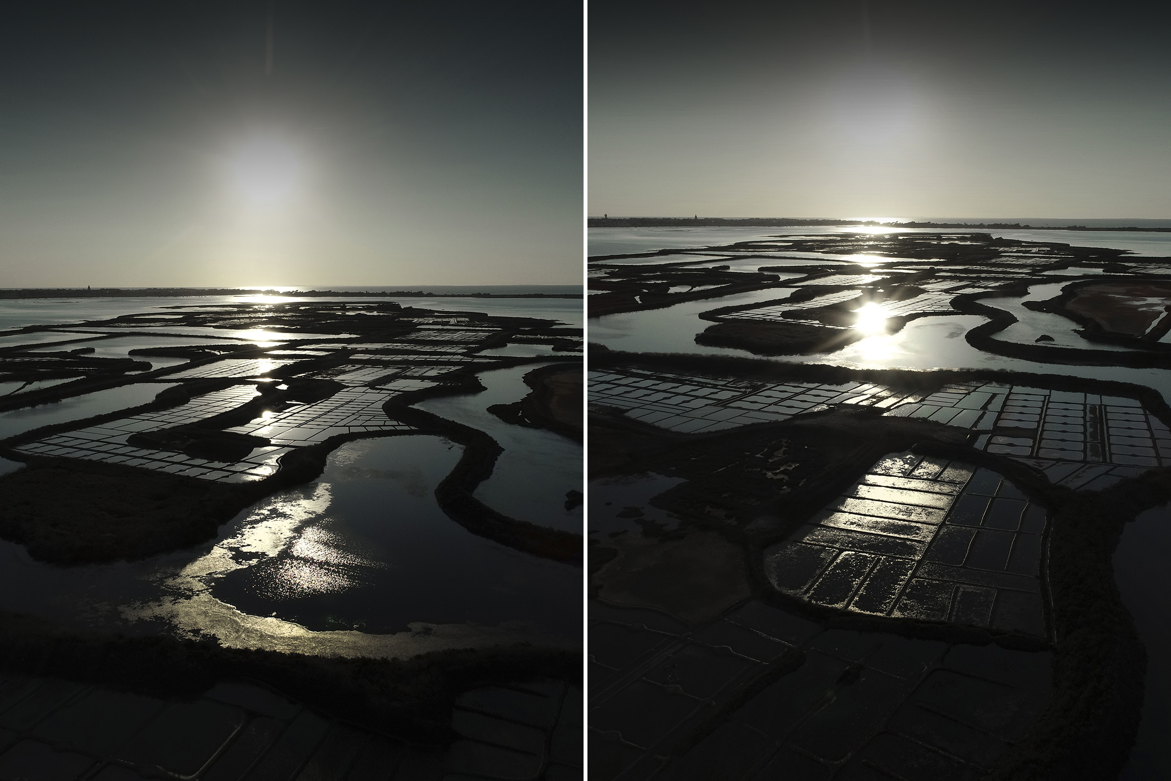 Inévitablement, ce contraste lumière solaire en reflet sur les oeillets salants sugère la beauté de la part de l'ombre, l'élégance raffinée d'une soirée en plein jour, l'attirance irrépréssive de se fondre au mystère.