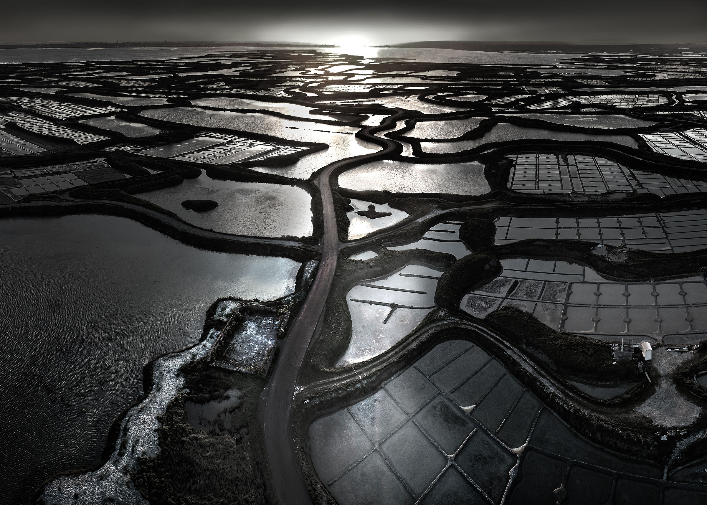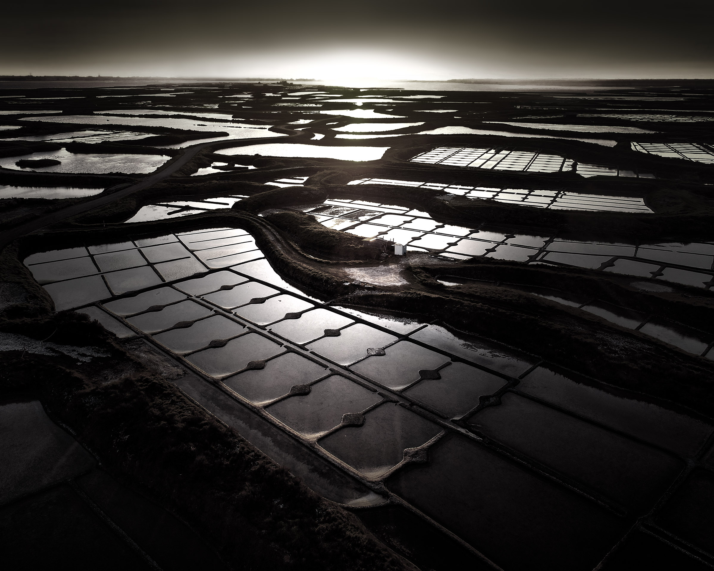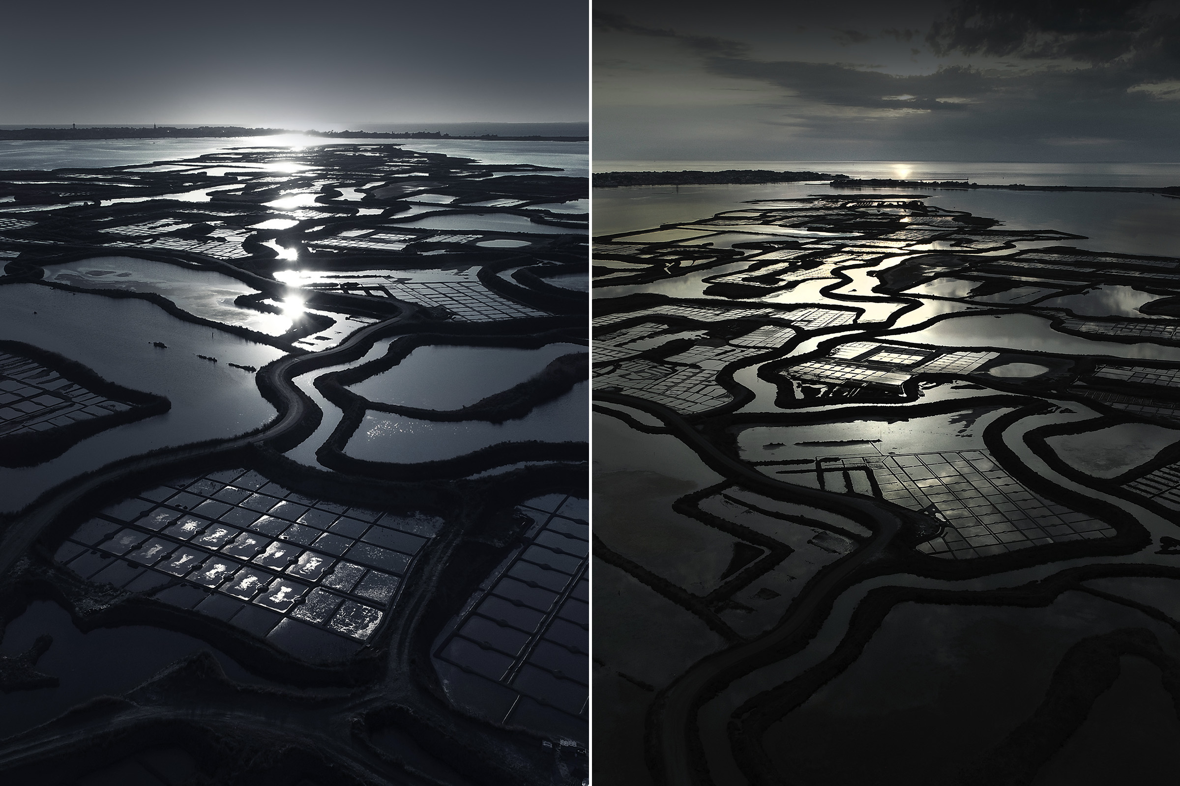 Inévitablement, ce contraste lumière solaire en reflet sur les oeillets salants sugère la beauté de la part de l'ombre, l'élégance raffinée d'une soirée en plein jour, l'attirance irrépréssive de se fondre au mystère.