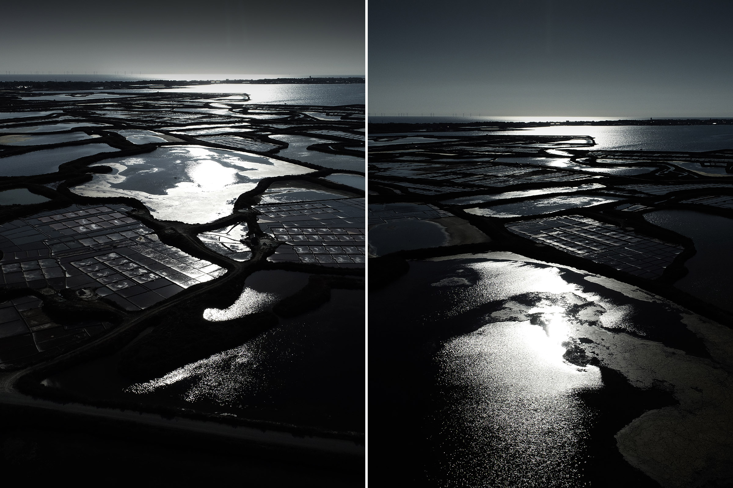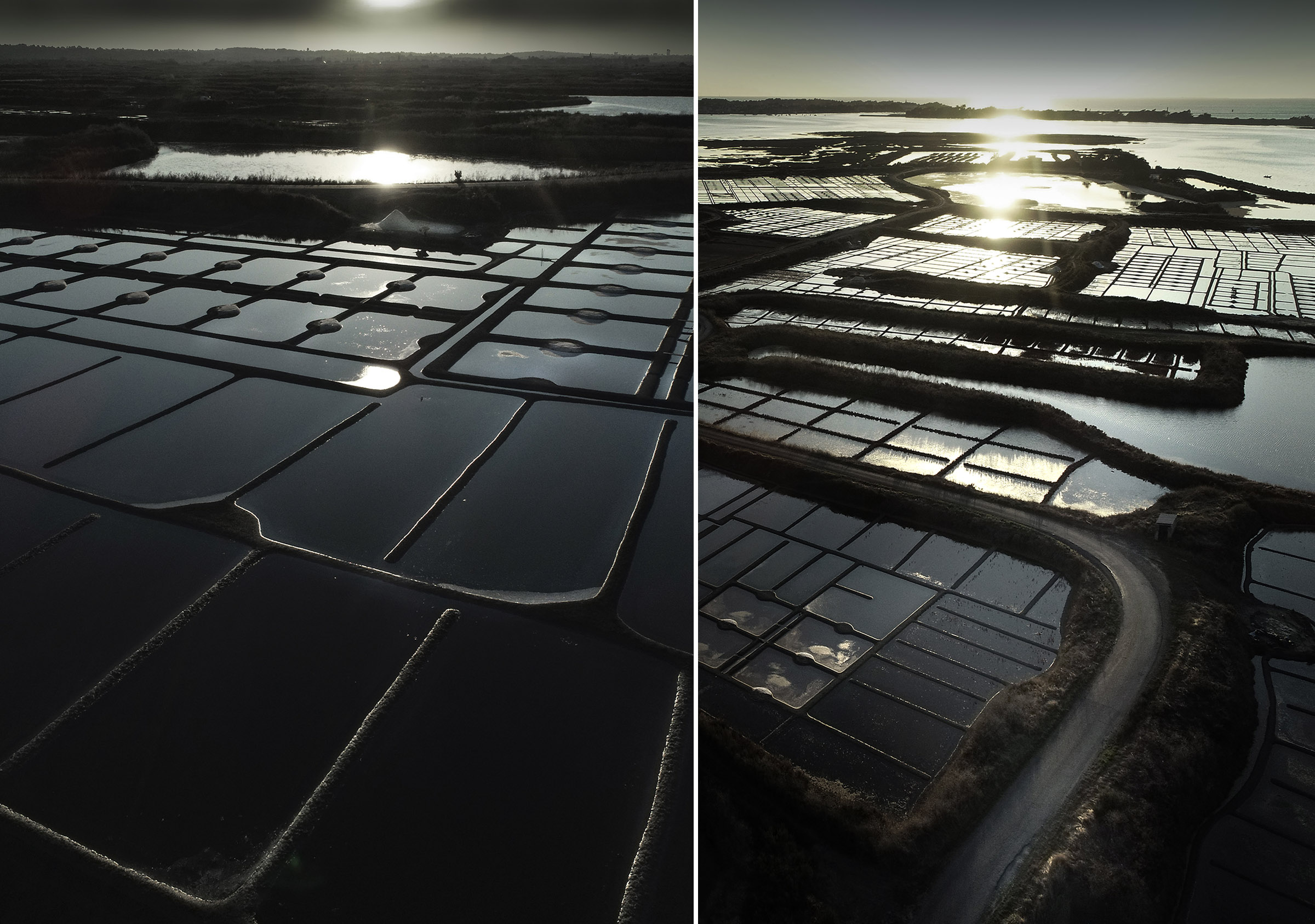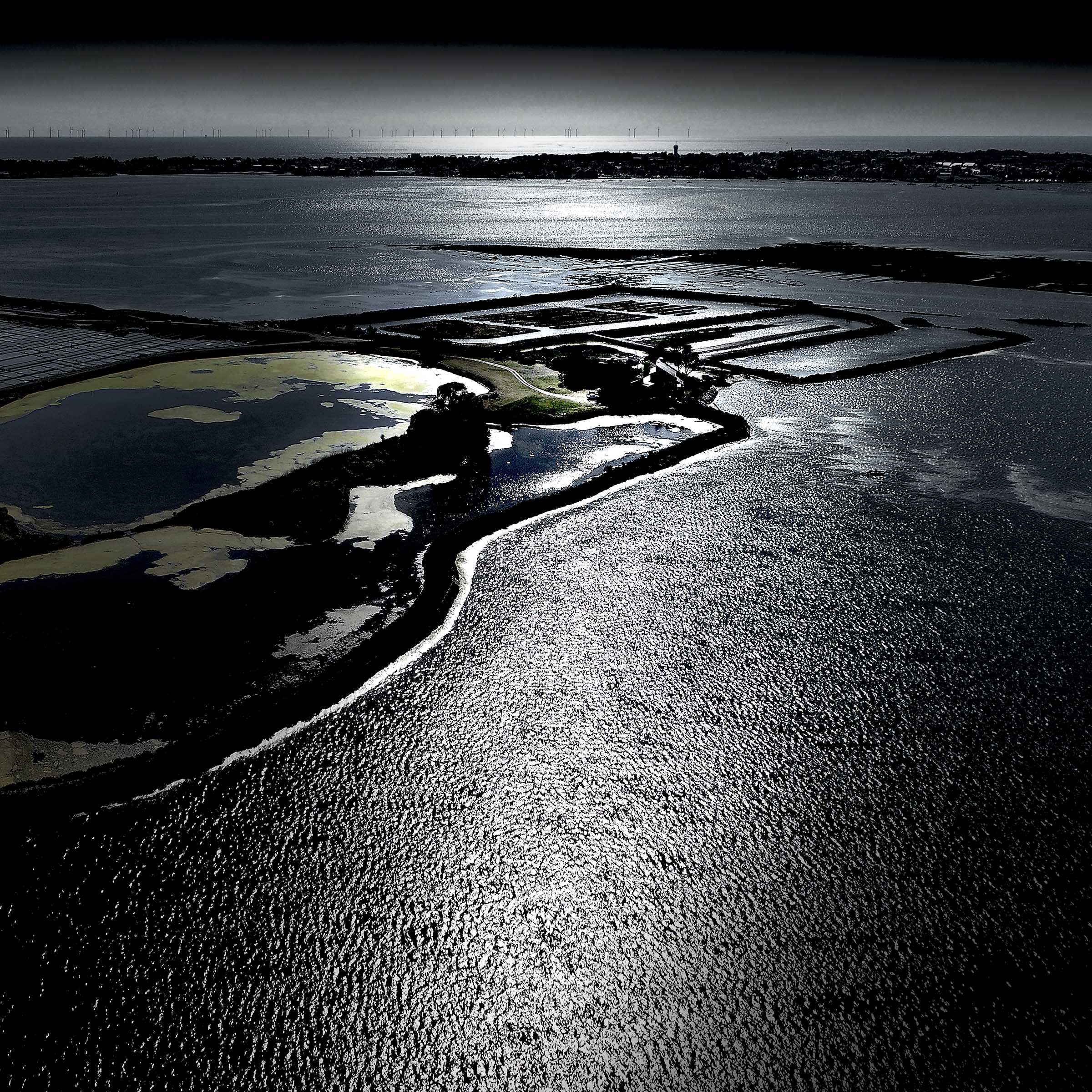Inévitablement, ce contraste lumière solaire en reflet sur les oeillets salants sugère la beauté de la part de l'ombre, l'élégance raffinée d'une soirée en plein jour, l'attirance irrépréssive de se fondre au mystère.
