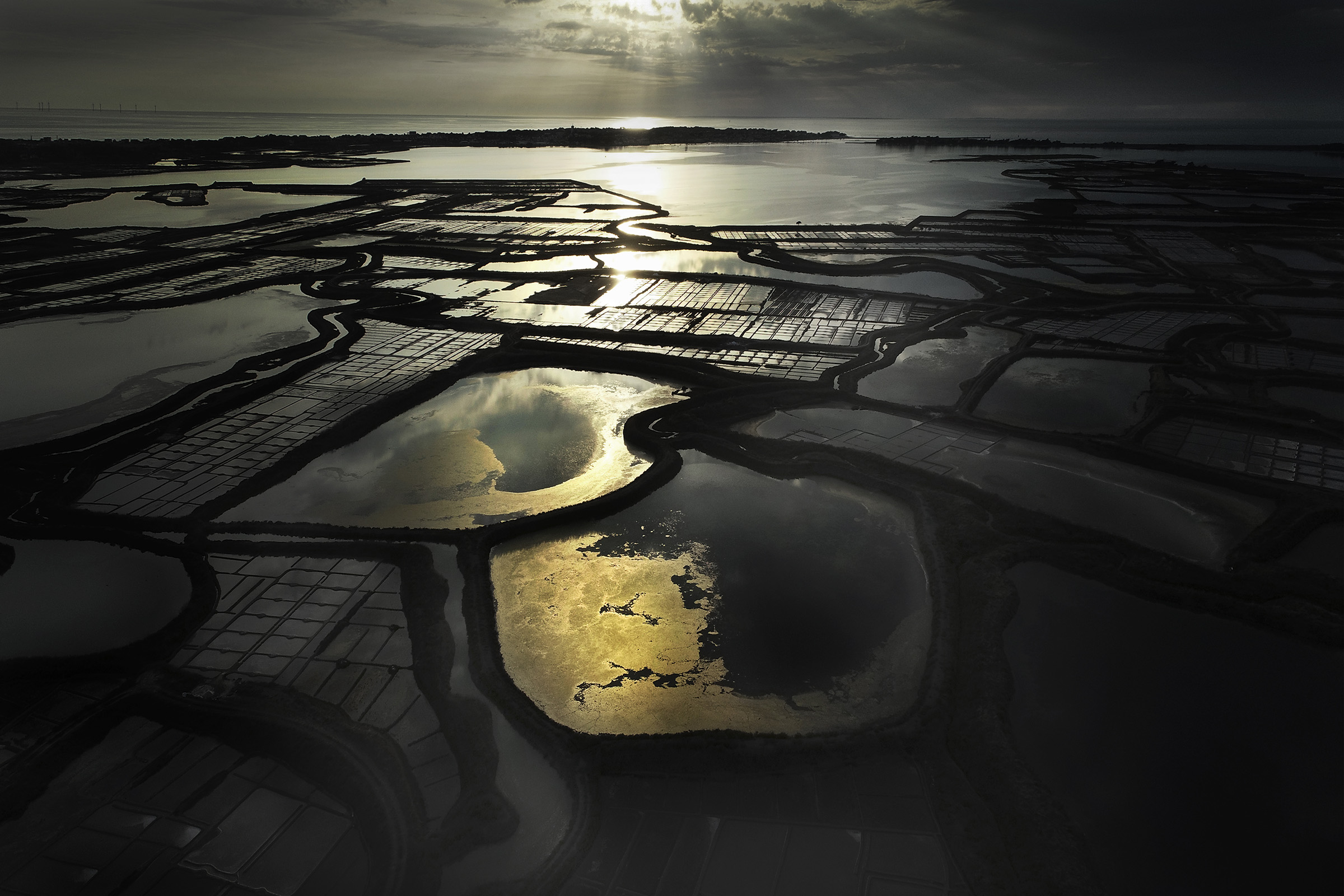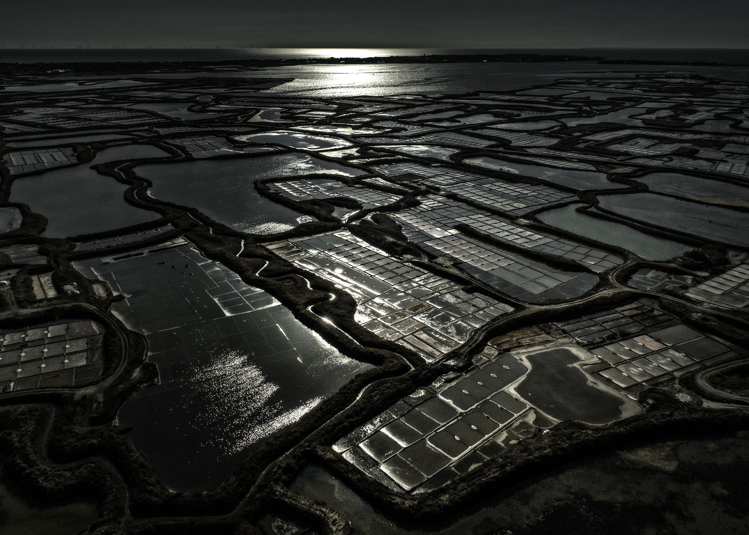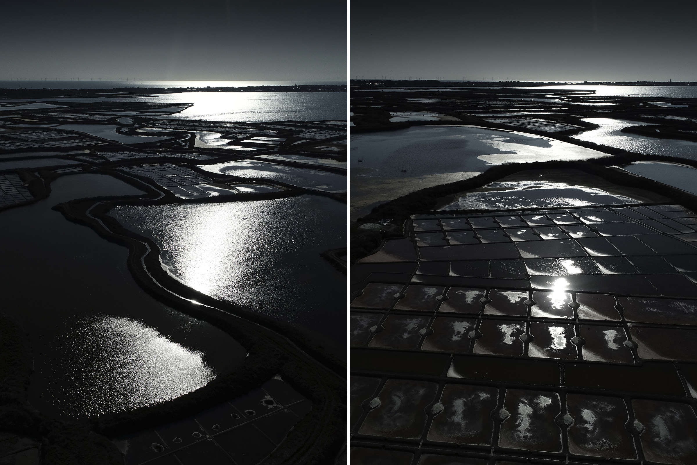 Inévitablement, ce contraste lumière solaire en reflet sur les oeillets salants sugère la beauté de la part de l'ombre, l'élégance raffinée d'une soirée en plein jour, l'attirance irrépréssive de se fondre au mystère.