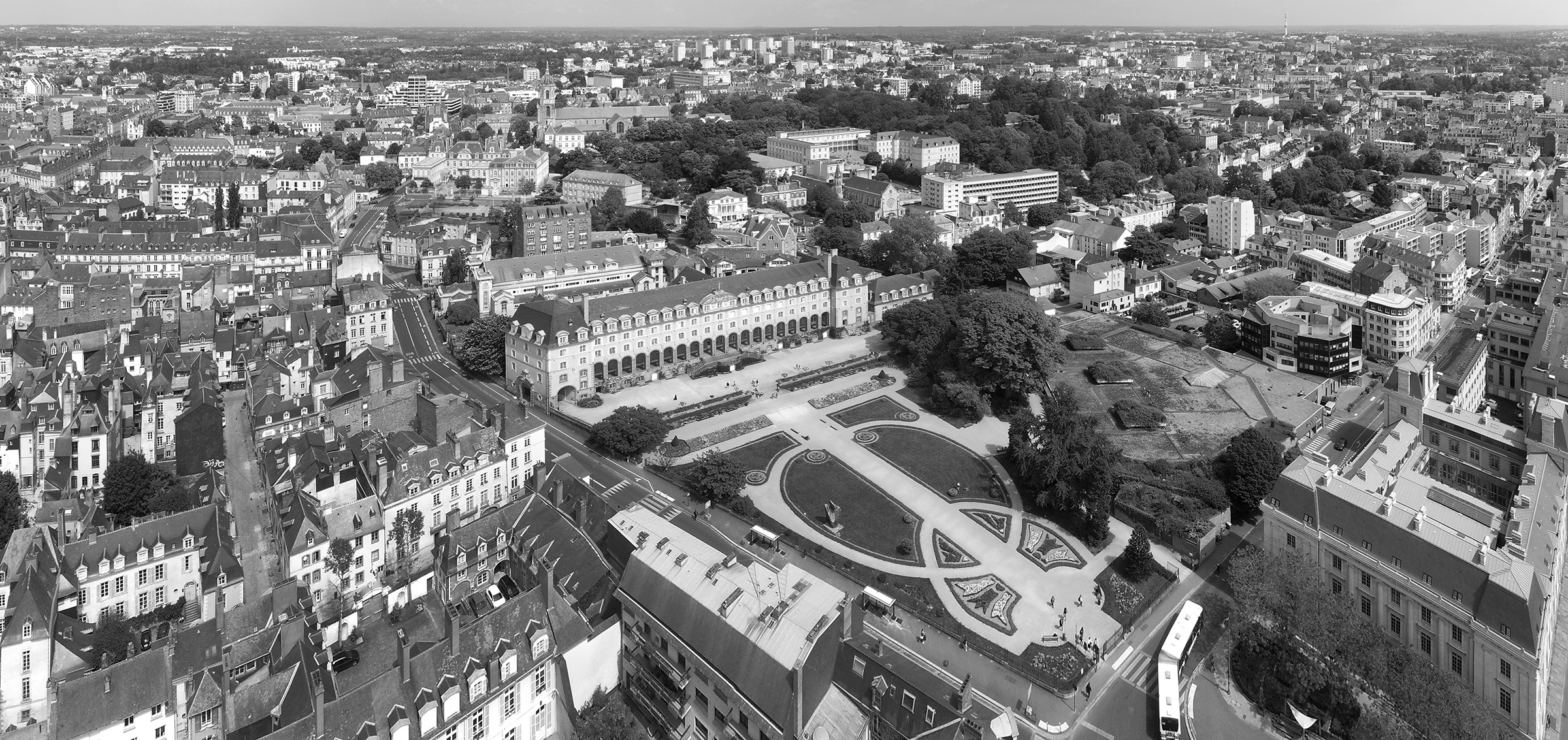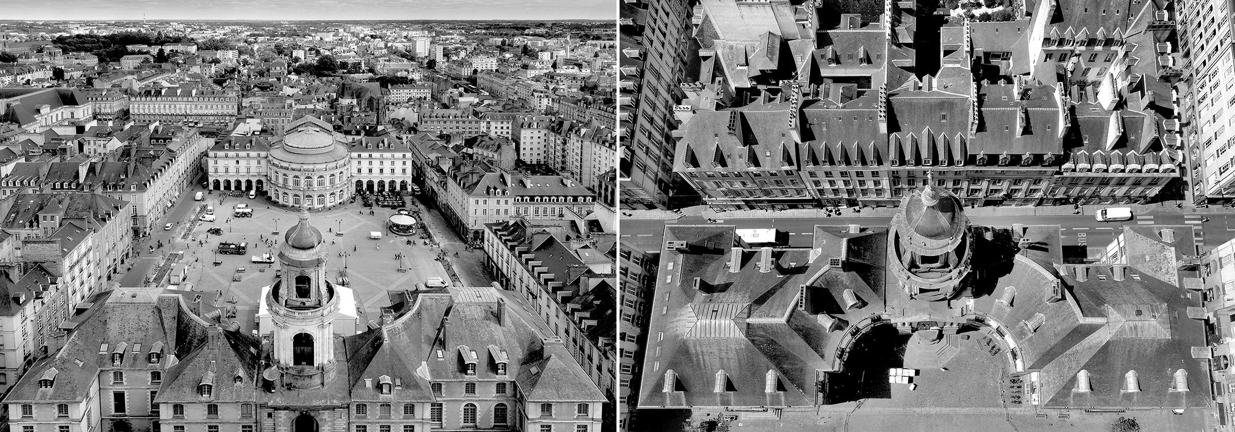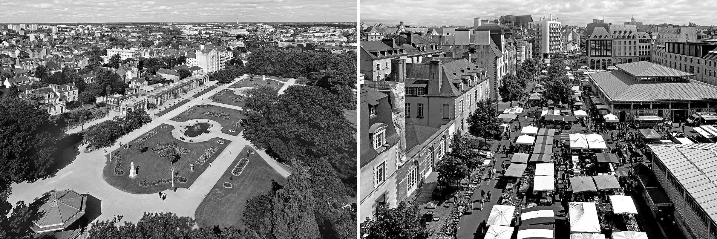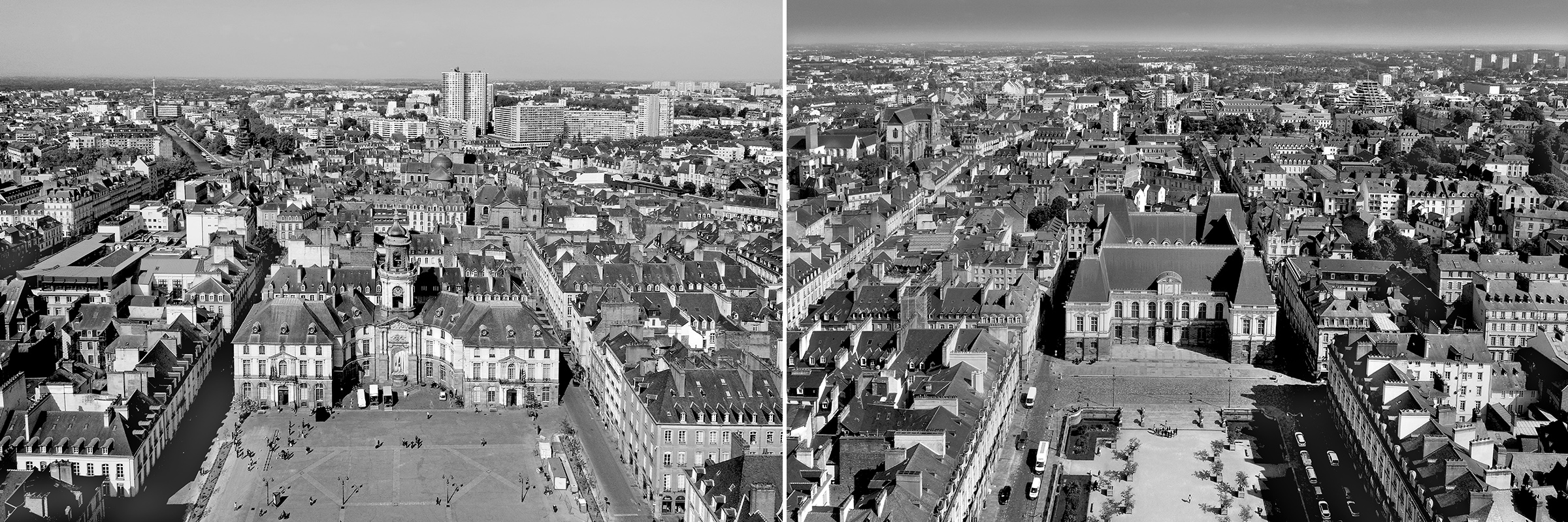 Rennes la ville rouge dont les toits d’ardoise se marient parfaitement au noir et blanc. Vision passéiste d’allure moderne rehaussée par une multitude de contrastes qui interroge la vue urbaine.