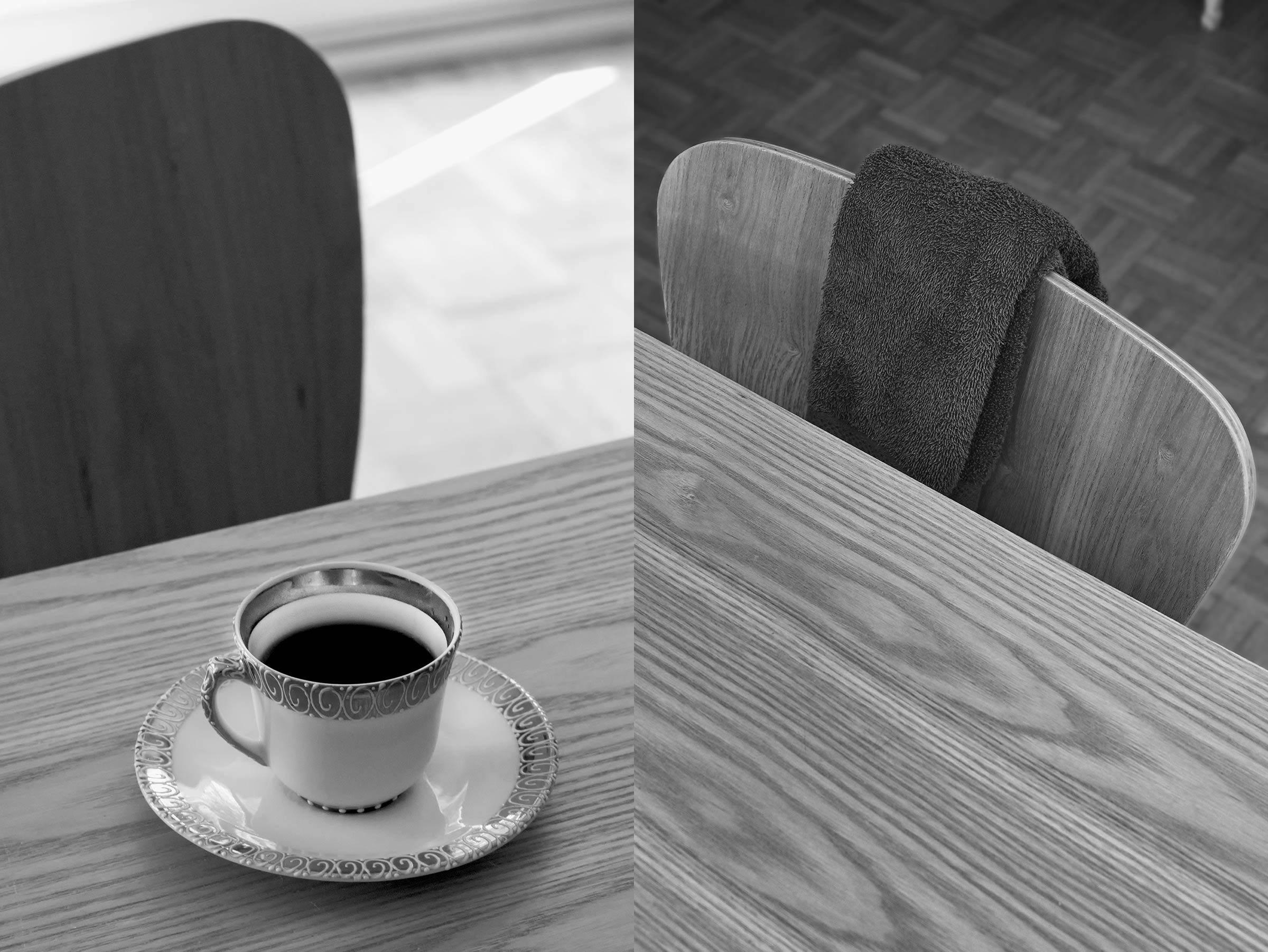 Table et chaises éventuellement saupoudrés d'objet, sur fond d'un parquet lamellé.